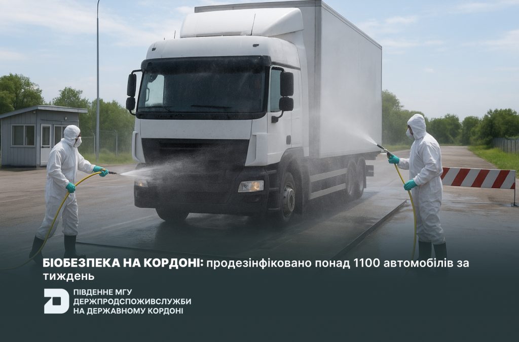 З 5 по 11 вересня 2025 року фахівці Південного МГУ Держпродспоживслужби на державному кордоні продезінфікували 1150 автомобілей, що перетинали державний кордон у пунктах пропуску Одеської області.