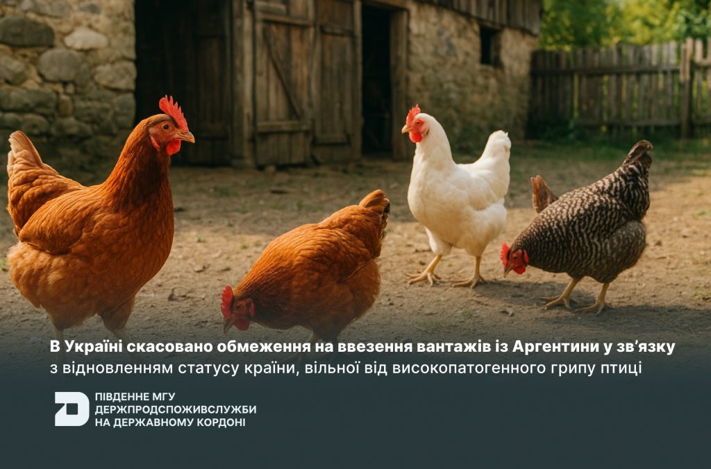 Південне МГУ Держпродспоживслужби на державному кордоні інформує: на підставі офіційного повідомлення компетентного органу Аргентинської Республіки та інформації, оприлюдненої на офіційному вебсайті Всесвітньої організації охорони здоров’я тварин (WOAH), Держпродспоживслужба скасувала раніше запроваджені тимчасові обмеження на ввезення в Україну вантажів із Аргентини, що підлягали ветеринарно-санітарному контролю у зв’язку з реєстрацією грипу птиці.