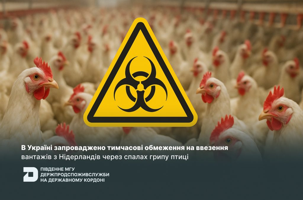 з 17 жовтня 2025 року в Україні запроваджено тимчасові обмеження на ввезення інкубаційних яєць, живої птиці, м’яса та продуктів з неї (крім тих, що пройшли термічну або іншу обробку, яка гарантує знищення збудника та відповідає ветеринарно-санітарним вимогам) із неблагополучних щодо високопатогенного грипу птиці зон Королівства Нідерландів, визначених компетентним органом країни.